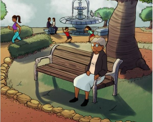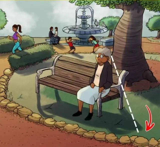 ¡Y aquí está el enigma resuelto! Si miras bien, el sol proyecta la sombra de todos los objetos y personas que vemos en la imagen, pero la abuelita que está sentada sola en el primer banco, no se ve.