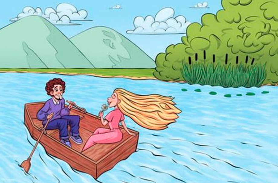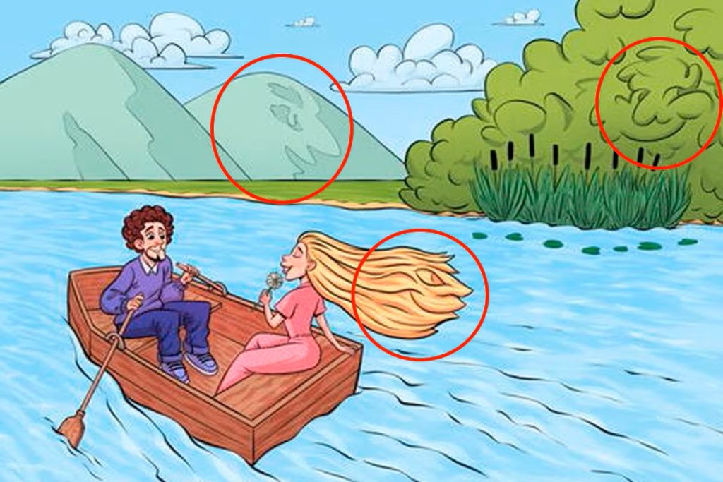 Esta pareja de enamorados salió a dar un paseo en bote, pero el dibujante quiso jugarnos una broma, escondiendo rostros de personas en los distintos componentes de este dibujo.